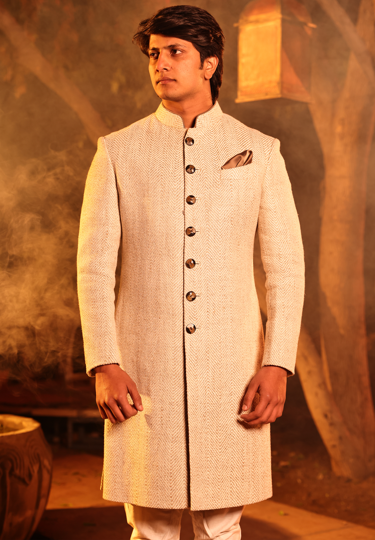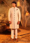 Cream Grey Herring Matka Silk Achkan