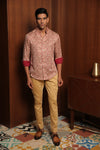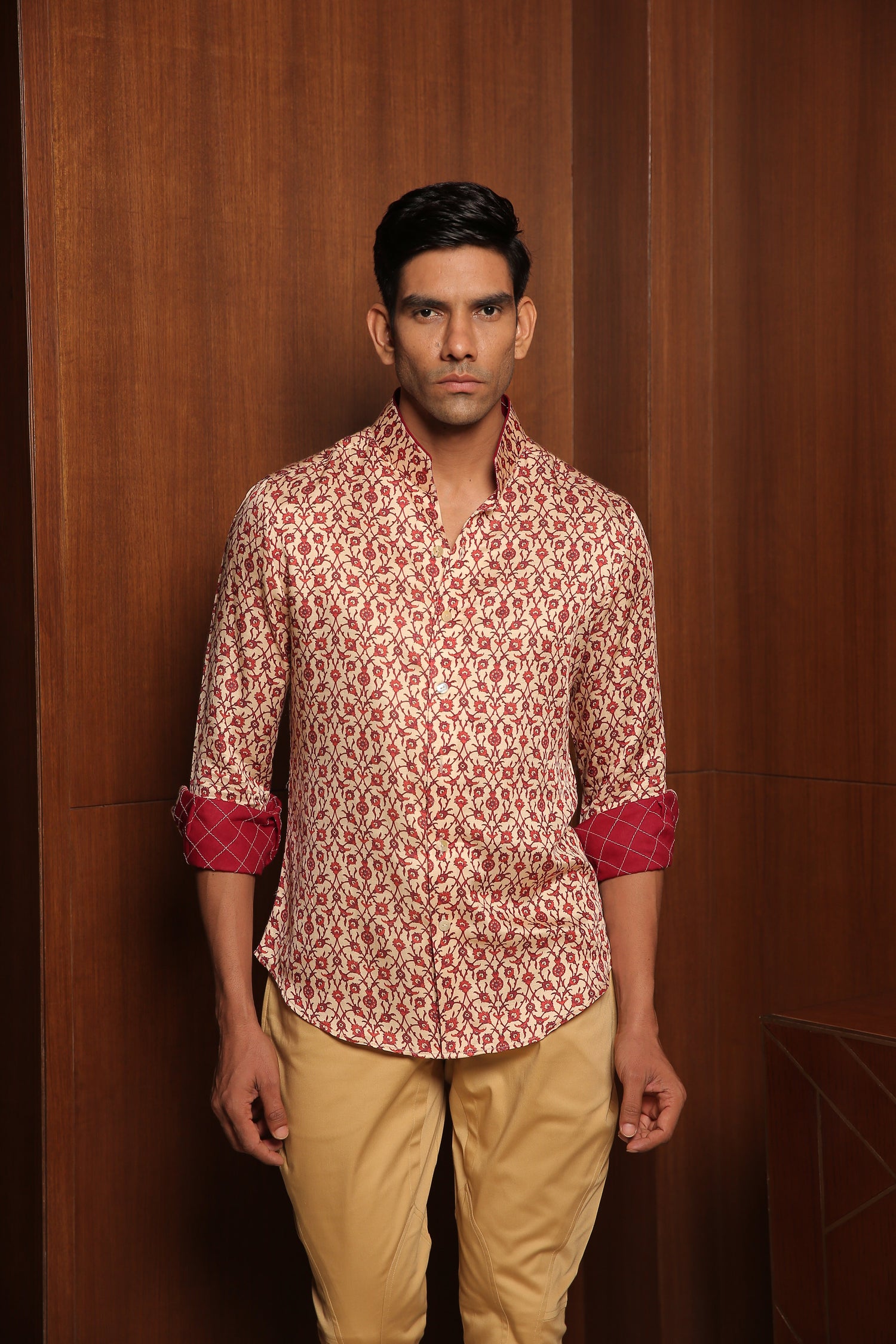Cream Maroon Jaal Printed Linen Silk Shirt